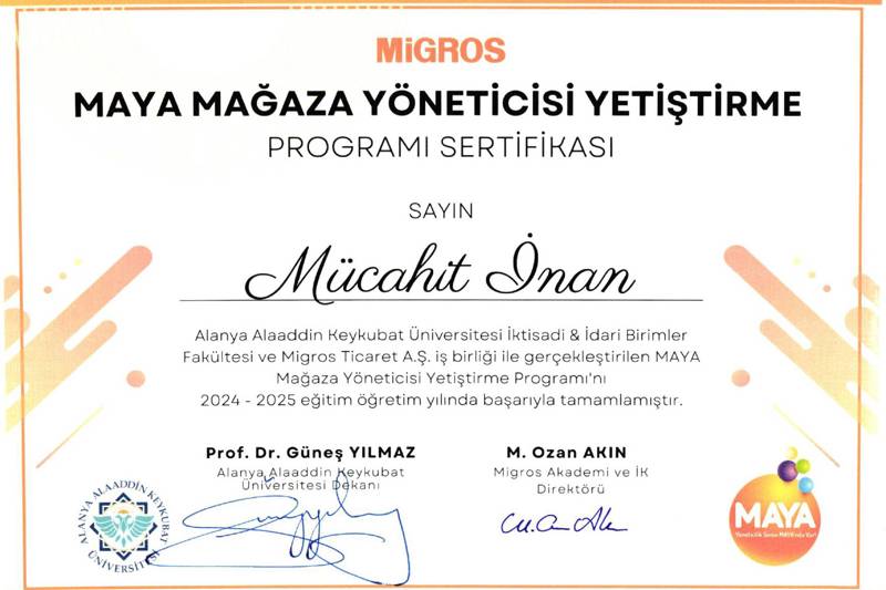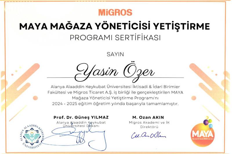 Alanya Alaaddin Keykubat Üniversitesi İktisadi, İdari ve Sosyal Bilimler Fakültesi ile Migros Ticaret A.Ş. iş birliğiyle yürütülen MAYA – Mağaza Yöneticisi Yetiştirme Programı, 2024-2025 eğitim-öğretim yılında başarıyla tamamlandı.